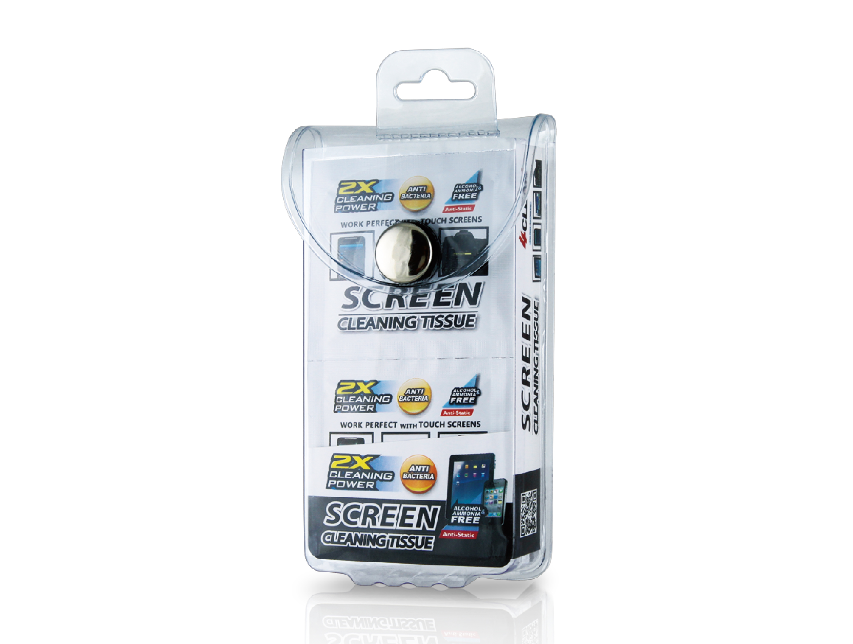 4CLEAN Pre-Moistened 2X Cleaning Power Screen Cleaning Tissue features our newly developed high-performance cleaning formula. It has passed the RoHS standard and SGS testing for its ability to prevent bacterial growth. Made from 100% wood pulp, the tissue leaves significantly less residual fiber after wiping compared to non-woven alternatives. In addition, the specially formulated solution dramatically reduces watermarks on screens after cleaning, ensuring a clear and streak-free finish.