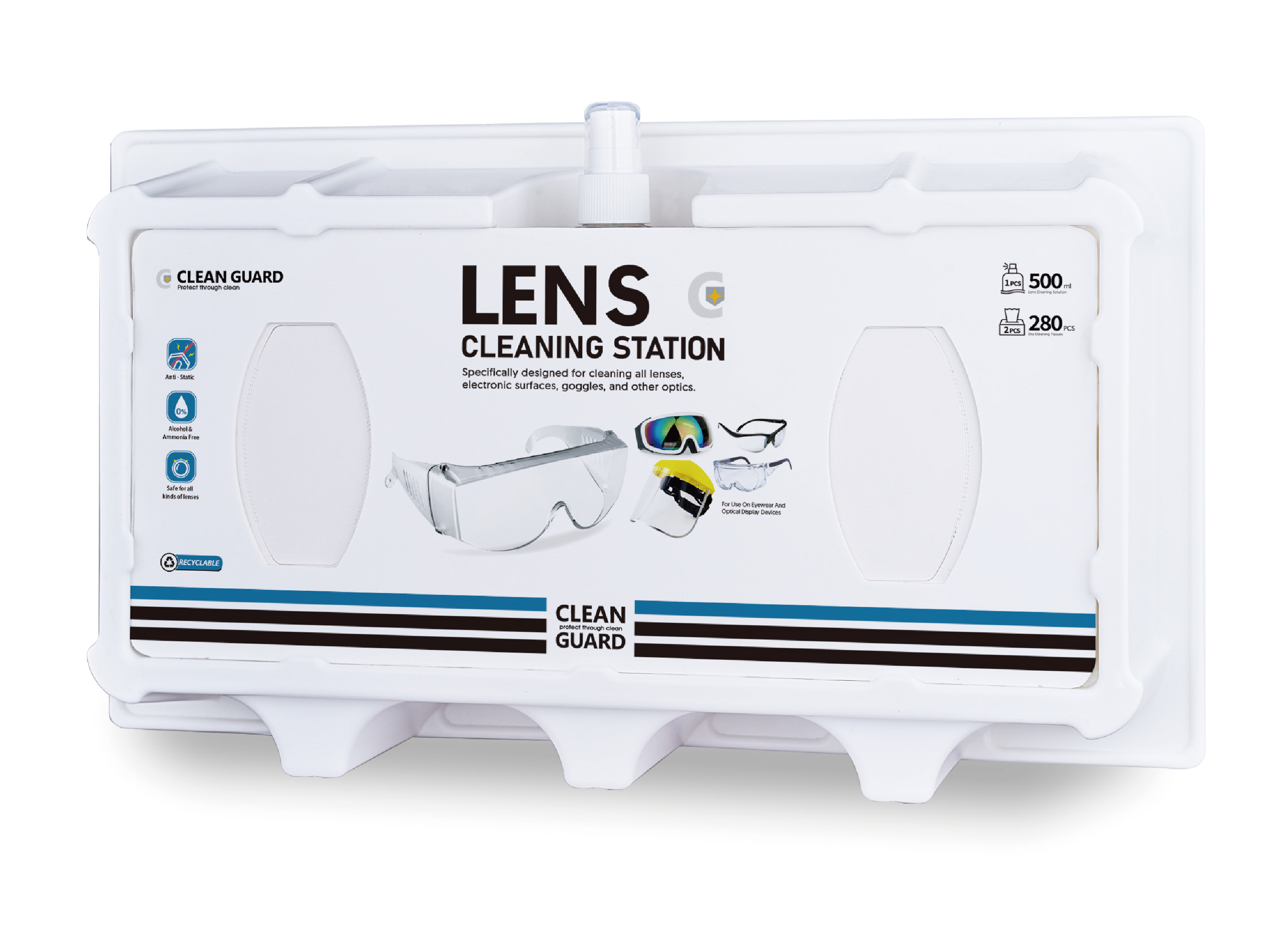 The Lens Cleaning Station combines a gentle, alcohol- and ammonia-free cleaning solution with low-lint, non-abrasive dry tissues made from soft, 100% wood pulp. Together, they effectively remove fingerprints, oils, dust, and smudges without leaving streaks or residue.